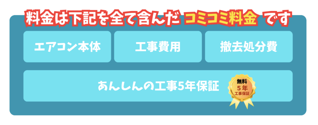ラーバス空調工事では、お客様のご期待に応えるためにホームページに掲載させて頂いている料金は下記の項目がコミコミの金額になっています。